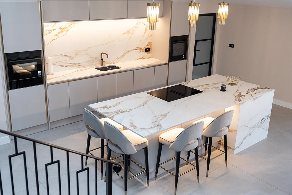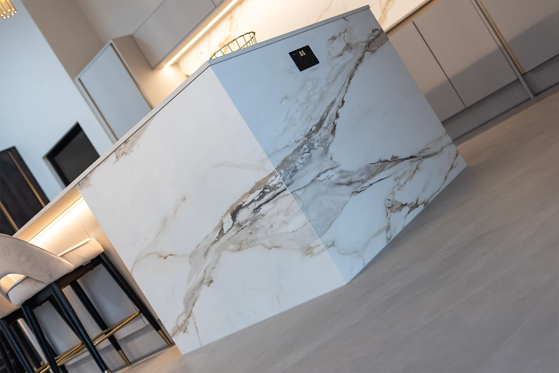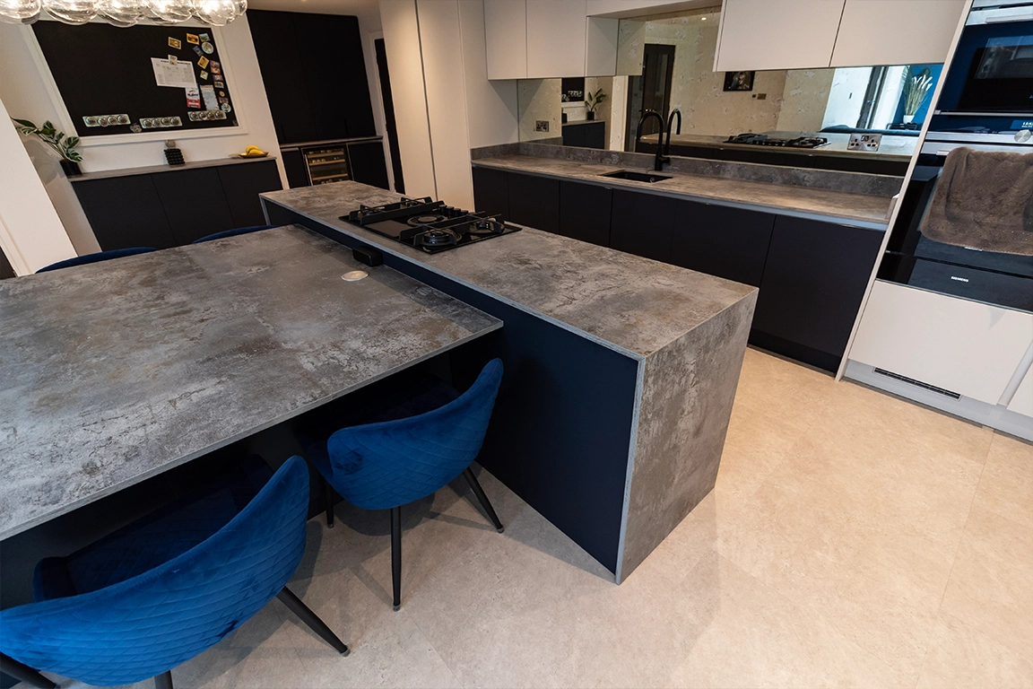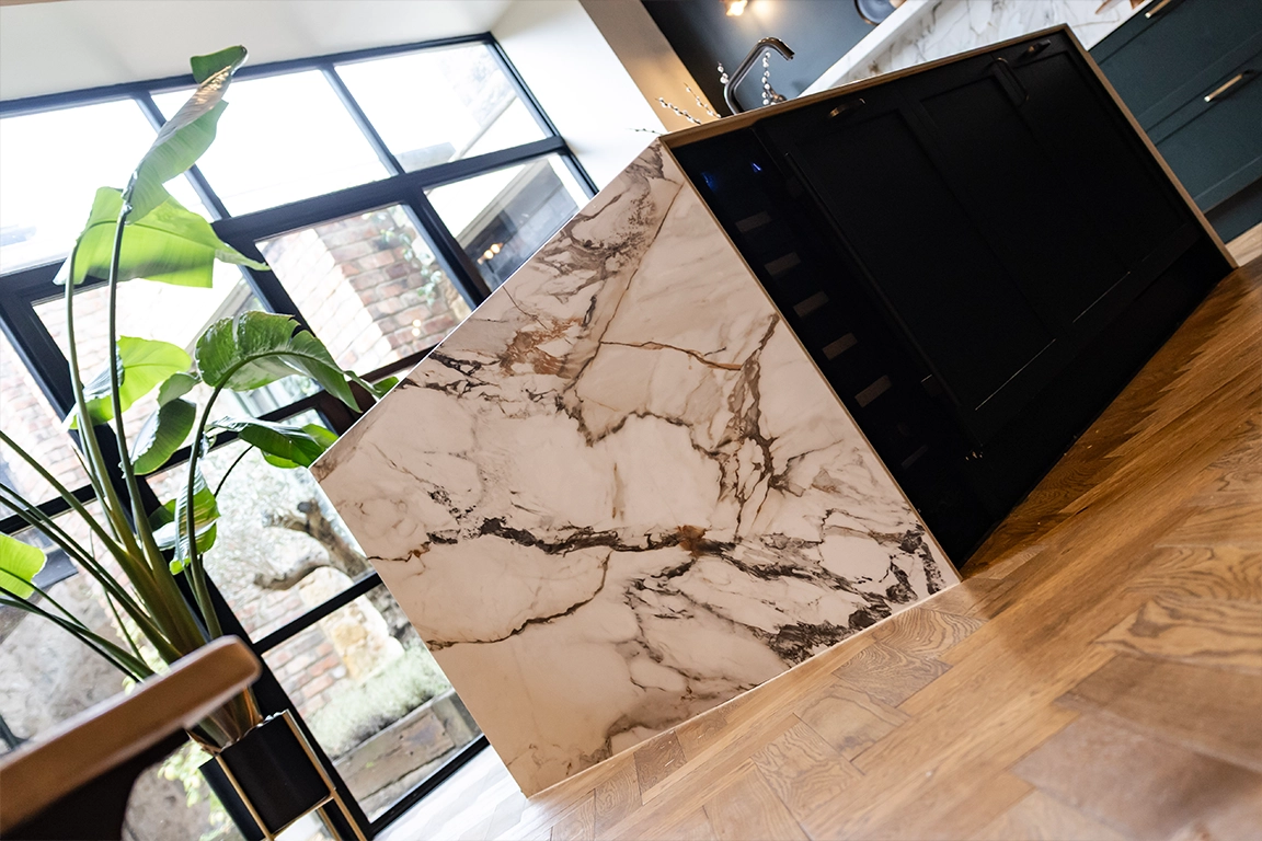 For worktops, peninsula, upstands and splashback around 5m² including design options, laser template, delivery and installation