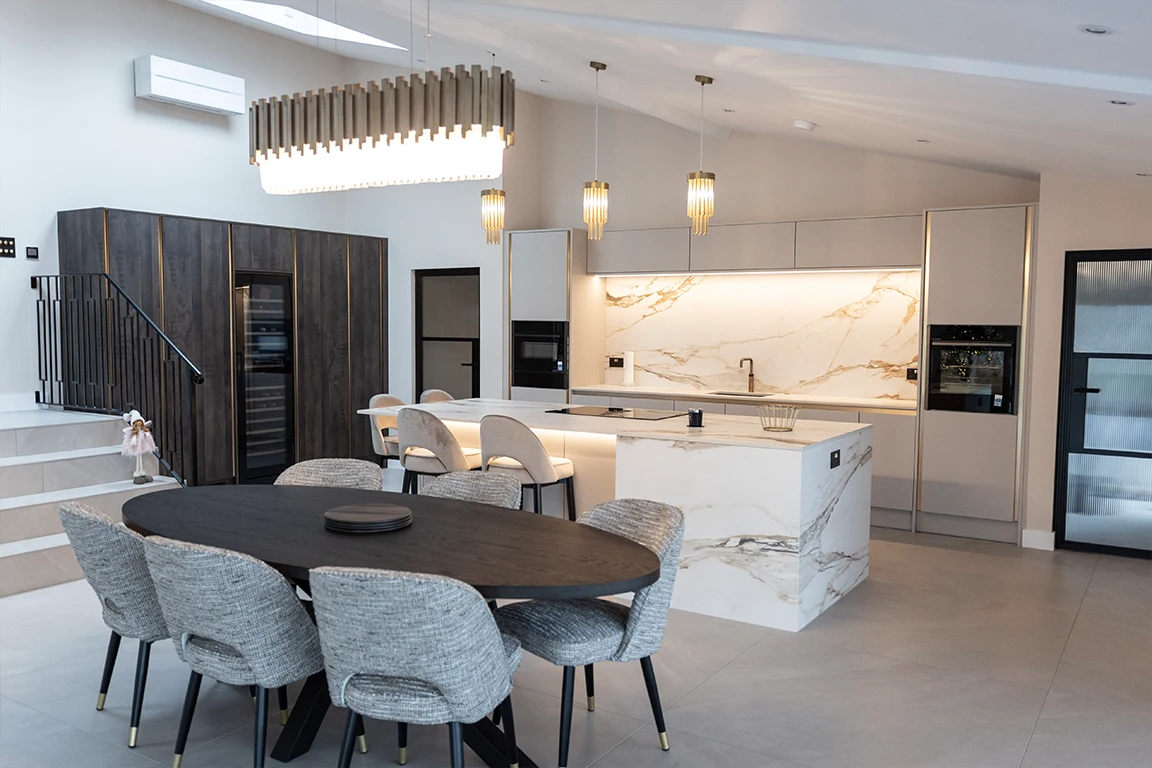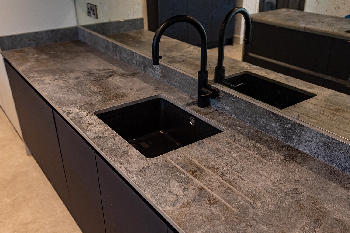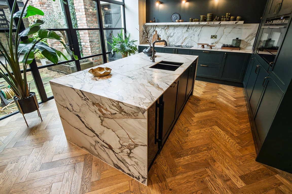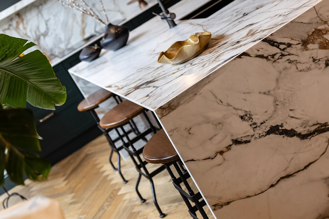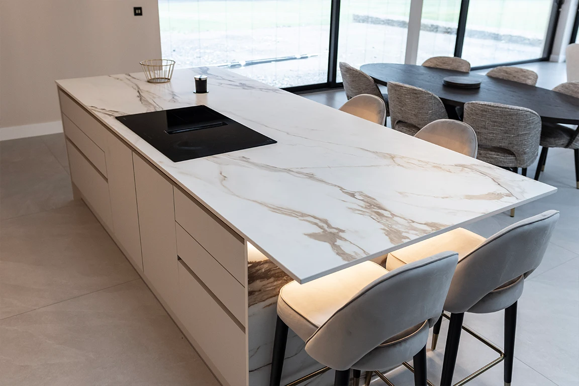 For worktops, peninsula, upstands and splashback around 5m² including design options, laser template, delivery and installation