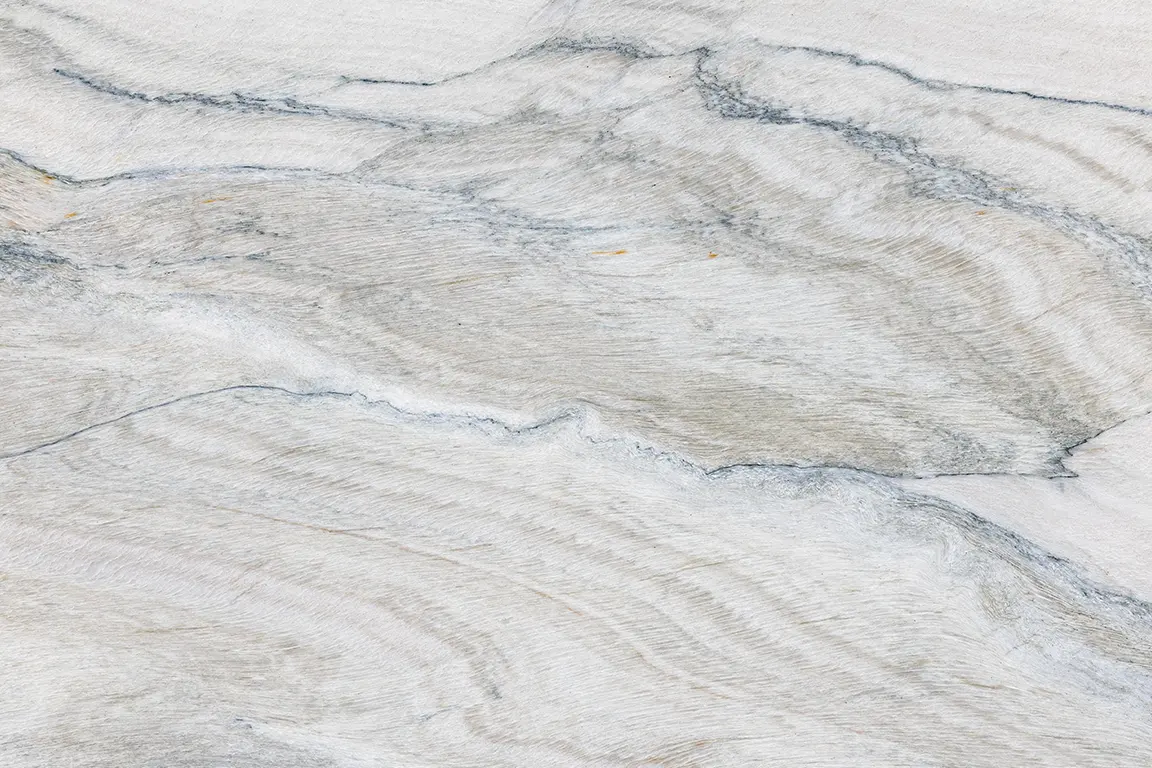 Macaubas Fantasy Quartzite is a breathtaking natural stone that brings a sense of light to any space. Its base is a soft white and pale grey canvas, gently enlivened by sweeping veins and flowing patterns in mid grey, smoky hues and occasional warm undertones. The movement across the surface feels organic and fluid, resembling ribbons of colour that give the stone depth and character without overwhelming the eye.