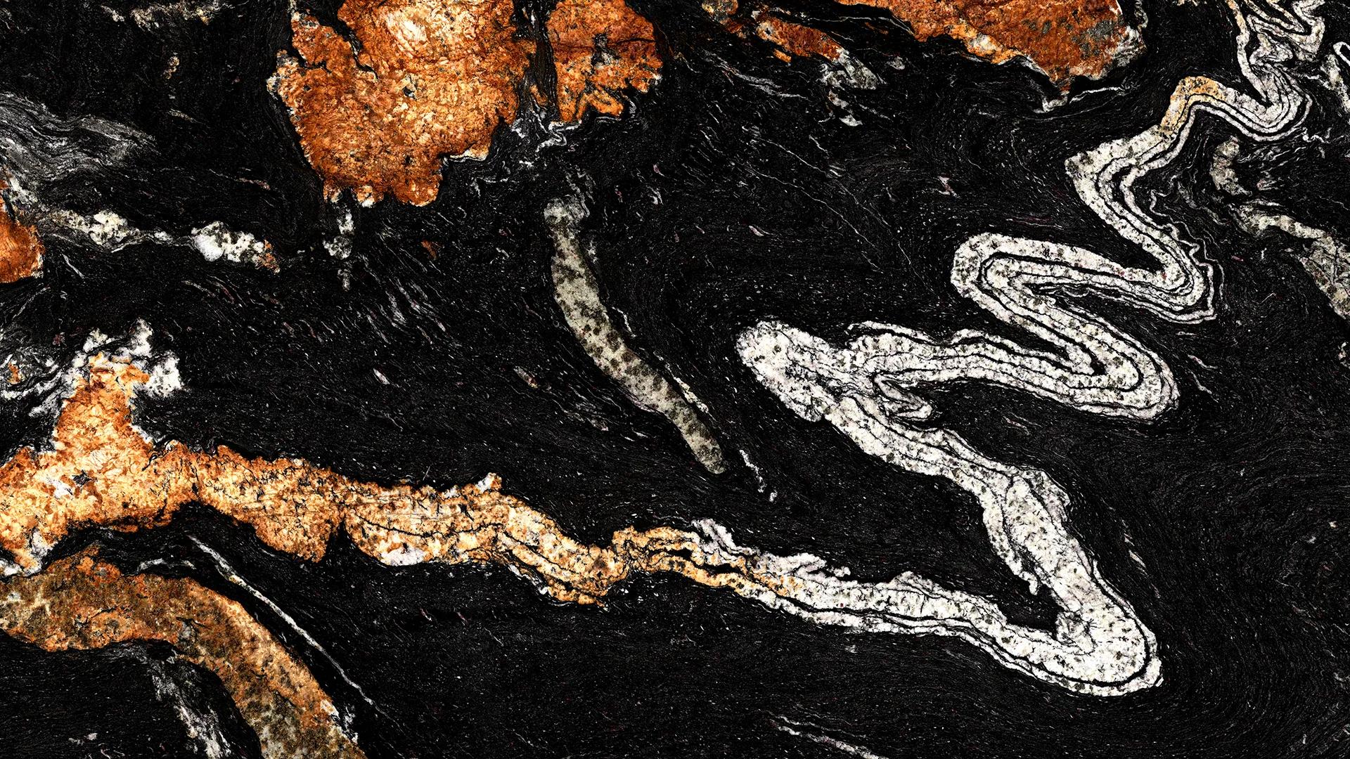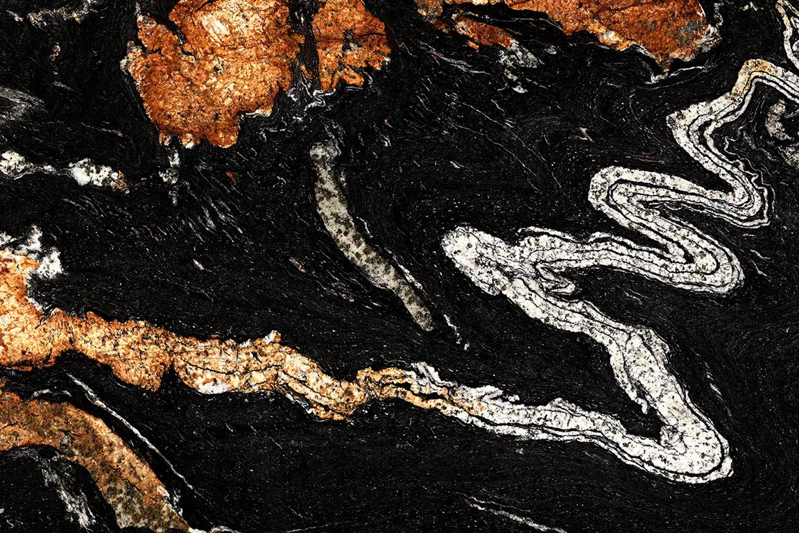 Sensa Orinoco is a bold granite with an intense base colour, highlighted by flowing veins of white, gold, and copper. The natural patterns create a dynamic, eye catching effect, making each worktop truly bespoke. Durable and low maintenance, Sensa Orinoco is perfect for adding a striking, luxurious touch to both modern and classic kitchen designs.